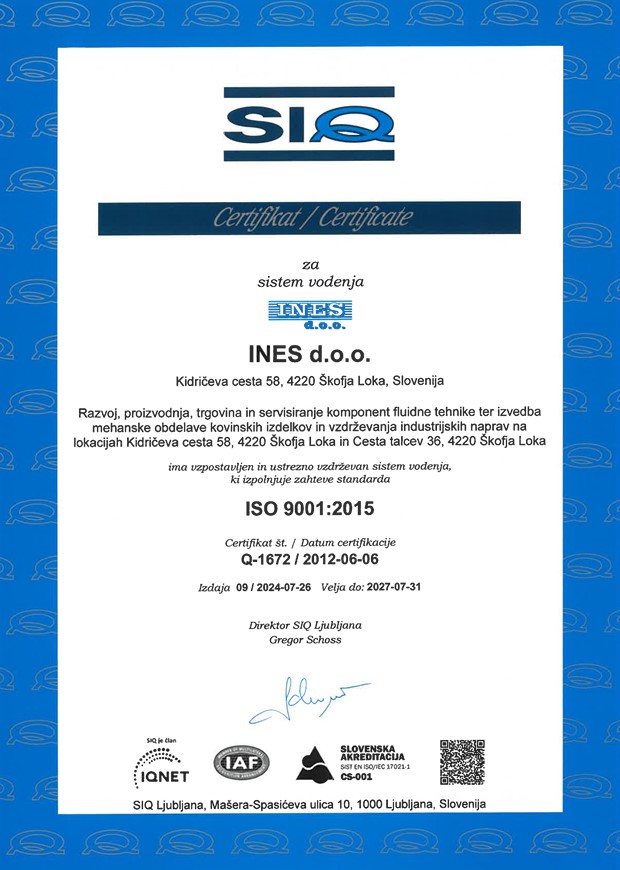 V podjetju INES d.o.o. kakovost potrjujemo tudi z mednarodno priznanimi certifikati. Z vpeljanim sistemom ISO 9001 zagotavljamo urejene procese, sledljivost in stalno izboljševanje kakovosti, kar našim partnerjem prinaša dodatno zaupanje in varnost pri sodelovanju.