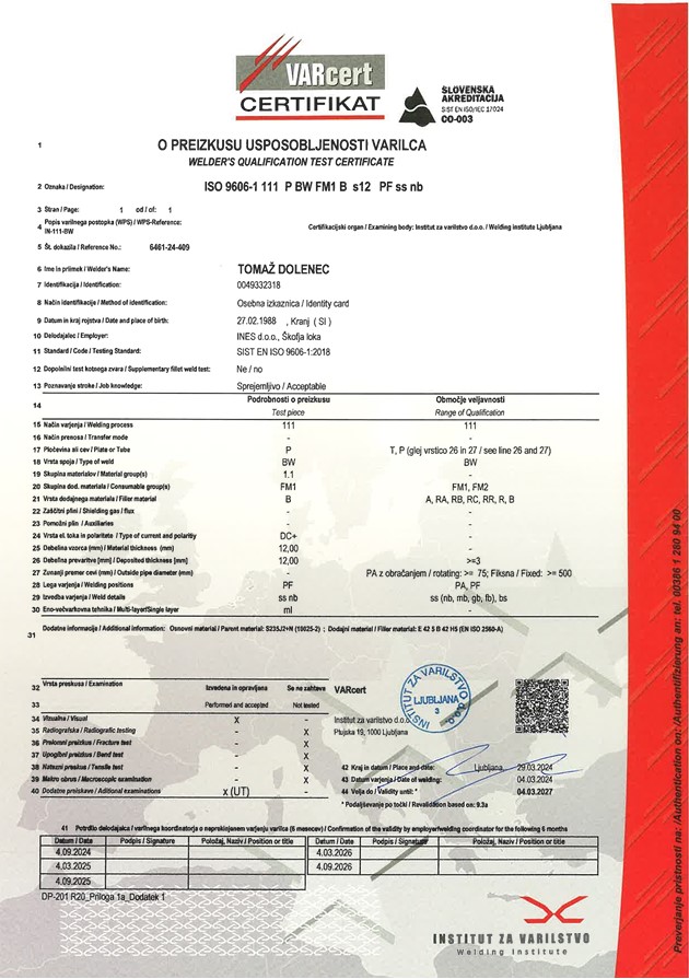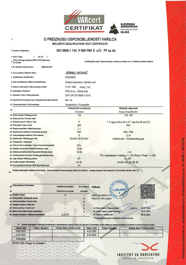 Na področju varjenja imamo več zaposlenih, ki so certificirani po standardu ISO 9606 za različne postopke in materiale. Ti certifikati dokazujejo znanje, usposobljenost in stabilnost pri izdelavi zvarjencev, ki morajo prenesti najvišje zahteve glede trdnosti in varnosti.